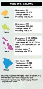KAUAI: New cases: 45 • Total cases: 19,525 • Average cases: 9 • Positivity rate: 10.6%