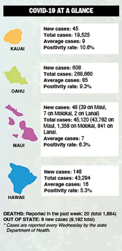 MAUI: New cases: 48 (39 on Maui, 7 on Molokai, 2 on Lanai) • Total cases: 45,120 (43,762 on Maui, 1,358 on Molokai, 841 on Lanai. • Average cases: 7 • Positivity rate: 6.3%
