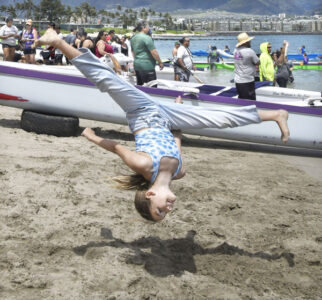 Kihei Charter School incoming fifth grader Siena Stromberg, 9, does an aerial at Kahului Harbor Saturday during the Maui County Hawaiian Canoe Association’s season opening John Wilmington III Memorial Regatta. Stromberg was at the beach with her parents to watch her sister Sophia compete for Kihei Canoe Club. Siena is an XL Gold Level competitor for 808 Gymnastics.