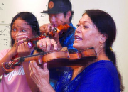 FIRST PHOTO: Paia Elementary School second grader Alika Filimoeatu, 7, gets some expert help with his viola bowing technique from Maui Pops violist Stacie Saito (right) and cellist Michelle Romero during the Maui Youth Philharmonic Orchestra’s instrument “petting zoo” Saturday at Queen Ka’ahumanu Center. The event gave interested youth a chance to play a variety of stringed instruments. SECOND PHOTO: Maui Youth Philharmonic Orchestra Music Director and President Iolani Yamashiro-Rahimi teaches a pizzicotto, or plucking, technique during Saturday’s instrument “petting zoo” at Queen Ka’ahumanu Center. In the background are Kalama Intermediate School seventh grader Makamae Ceballos-Lagazo, 12, and recent Kamehameha Schools Maui graduate, brother Devin Ceballos-Lagazo, 18. “We just want to give them an opportunity to try strings,” Yamashiro-Rahimi said, noting that classical stringed instruments are not a regular part of school curriculums. “Everybody is gifted in some area. They won’t know unless they try.” The organization will hold more sessions at 10 a.m., 11 a.m. and noon on Aug. 5 and Aug. 12. For more information, visit mauiyouthphilharmonic.org.