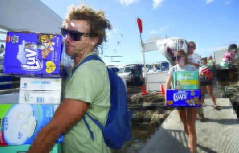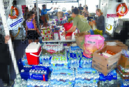 - Calypso crew members organize donated goods aboard the boat Friday at Maalaea. — The Maui News / MATTHEW THAYER photo