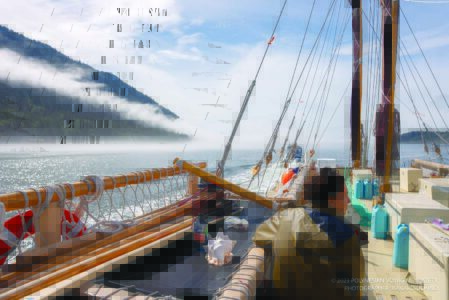 Hokule‘a sails from Prince Rupert to Hartley Bay in British Columbia on July 20. The journey was delayed by fog, and crew members had to be wary of floating obstacles in the water once they set out. Polynesian Voyaging Society / KANAKO UCHINO photo