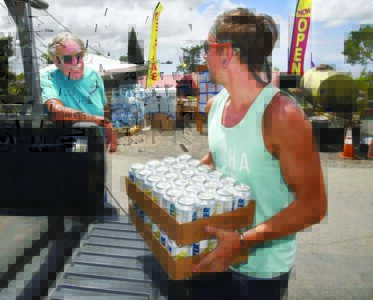 - Kula Hub volunteer James Barry loads two cases of canned water into Kula resident Steve Thurman’s truck Friday afternoon. Thurman joked that they looked like cases of beer, but said he has been bathing with the canned water since getting sick while taking a shower in his home due to contaminated water lines. He said the hub has helped his family and many others get through a challenging time. “This has been a godsend,” he said. — The Maui News / MATTHEW THAYER photo