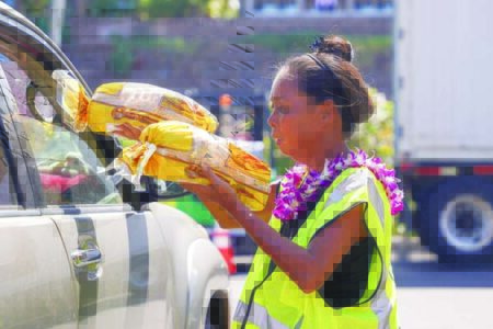 - Maria Glasheen, a volunteer with Global Empowerment Mission and a part-time resident of Maui and California, hands loaves of bread to people passing through the drive-thru of the distribution hub at the Kahana Gateway Shopping Center on Friday morning. — The Maui News / COLLEEN UECHI photo