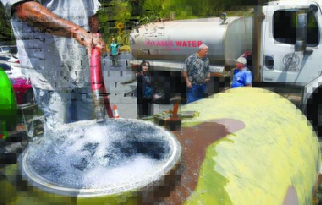- Maui County Department of Water Supply crew member Donald Correia tops off a water tank at the Kula Hub Friday afternoon while equipment operator Rowdy Fernandez talks with Maui County Mayor Richard Bissen and Hawaii Lt. Gov. Sylvia Luke. Bissen and Luke visited distribution hubs in Kahana, Kahului, Pukalani and Kula. “We wanted to see how everything is integrated to provide the different support needed for each community,” said Luke, who said she has been spending about three days a week on Maui. “Each hub had a different character. They reflected the individual character of each community.” — The Maui News / MATTHEW THAYER photo