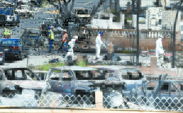 A hazardous materials crew works in a Wahikuli neighborhood Friday afternoon. Once the U.S. Environmental Protection Agency finishes removing hazardous materials, the U.S. Army Corps of Engineers will work to remove debris left by the Aug. 8 fire. On Friday, the White House announced that the federal government will cover 100 percent of the costs of debris removal during a set period of the state’s choosing. — The Maui News / MATTHEW THAYER photo