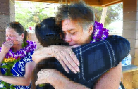 - Jacqui Simpson, mother of fallen EMT Tony Simpson, receives a hug from Lanai resident Mindy Bolo before the start of Saturday morning’s celebration of life at Hanakao‘o Beach Park in Lahaina. In the background is Tony Simpson’s sister, Nova Simpson. Tony Simpson, who worked as an EMT on Lanai while living in Lahaina, was on his day off on Aug. 8 when he died in the fire that destroyed most of the town.