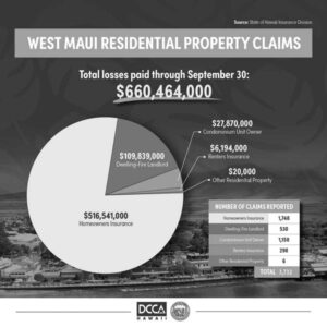 - A chart shows the number of insurance claims and estimated losses for West Maui residential properties after the Lahaina wildfire. Graphic courtesy Insurance Division