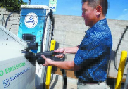 - Hawaii Department of Transportation Highways Division Dep. Director Robin Shishido demonstrates how to use a charger Wednesday.