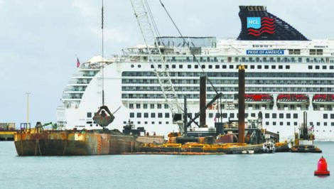 - The dredging company’s barges, crane and support boats are dwarfed by the Pride of America cruise ship docked at Pier 1 Monday. — The Maui News / MATTHEW THAYER photo