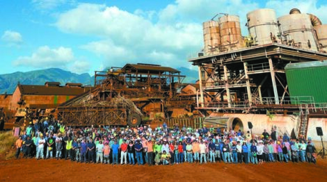 - Puunene Mill employees gather a group photo on March 1, 2016, the day the mill’s last sugar cane harvest started.