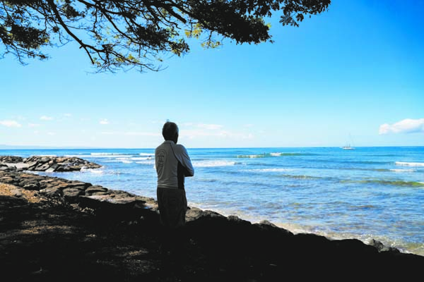 Abraham “Snake” Ah Hee, one of the first crew members of Hokulea —the Polynesian double-hulled voyaging canoe, looks at the ocean at Launipoko Beach Park on Feb. 23 in Lahaina. Hawaii authorities said Thursday that coastal waters off the wildfire-stricken town of Lahaina pose no significant risk to human health and it’s safe to surf and swim there. AP file photo/Mengshin Lin
