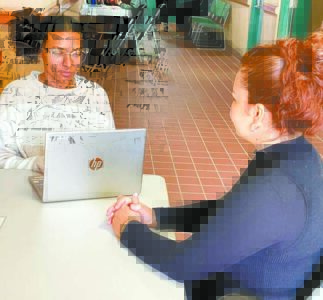 Monni Nash, Maui Relief TANF Program manager, helps an applicant for the program that assists those directly impacted by the Aug. 8, 2023 wildfires at Maui Economic Opportunity offices in Wailuku. Program applicants can sign up in-person at MEO, weekdays from 8 a.m. to 4 p.m. Courtesy photo