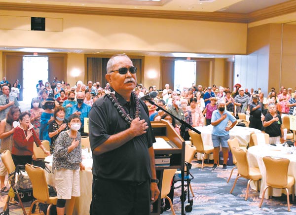 - David Yanagisako leads the Kupuna Aloha Luncheon in the Pledge of Allegiance on July 30, 2022, at the Grand Wailea. In an election year, more than 40 candidates for public office met with kupuna at the event Courtesy photo