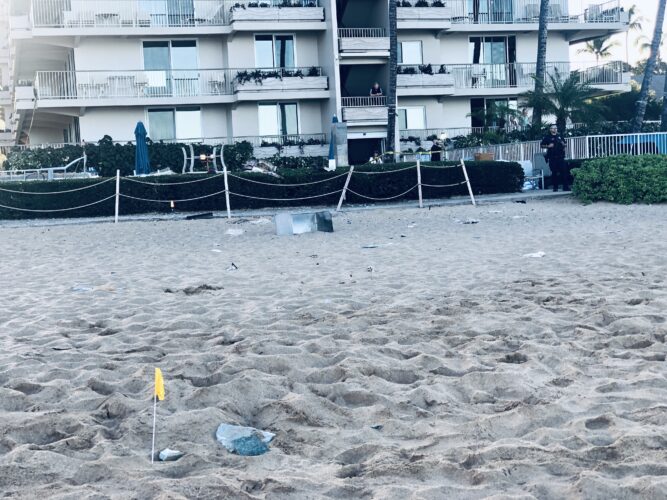 Small yellow flags were posted near the items in the sand. Some were more than 30 feet away from the resort property, including what appeared to be broken pieces of ceramic-looking tile.