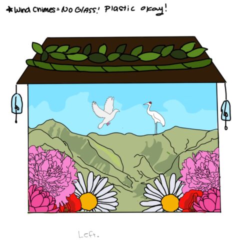 On the design of the front and side panels, Harriman said, “We also thought that adding different shoes on the beach adds to them by showing different ‘walks of life.’ The birds are a dove and a crane which are both symbols of prosperity and peace. Then we added peonies, poppies, lotuses, and daisies which in the language of flowers and different cultures can also mean peace. We thought that everyone rides the ‘waves of life’ so we decided to depict that by strings of flags following a person on a surfboard would be a creative interpretation. When people view them from the sides, we want people to see from the mountain to the ocean together we carry peace all together.”