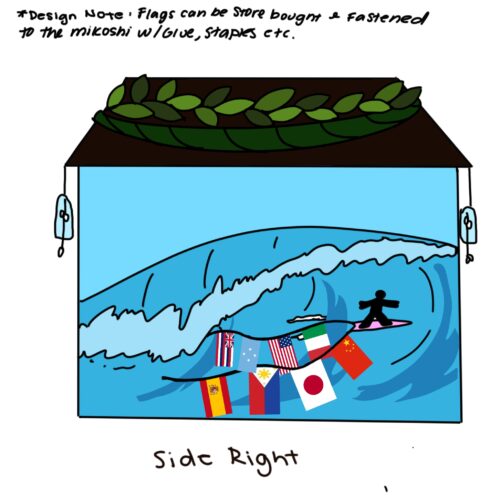 “For our design we tried to depict how in the past and going to the future, from the mountain and the sea we are all together!” said Faith Harriman, a King Kekaulike High School student responsible for compiling the group’s ideas and illustrating the mikoshi design. “We chose to drape maile lei because it has an underlying meaning of peace and harmony. We also thought a humpback whale could represent how even one creature can remind us of how small we are. By ourselves we may be small but by collaboration and cooperation we can make huge accomplishments.”