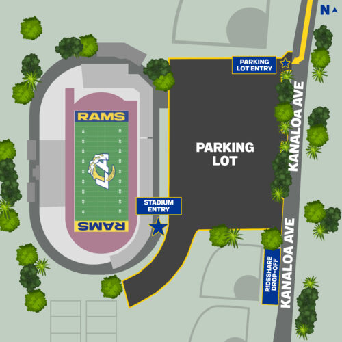 This map shows parking plans for the Los Angeles Rams minicamp at War Memorial Complex on Wednesday. Ticketed fans can enter the parking lot via Kanaloa Ave heading southbound. Parking is first come, first serve and you must show your ticket to enter the parking lot. Tickets have sold out. Courtesy photo