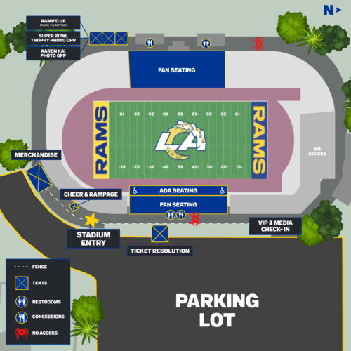 This map shows a layout for the Los Angeles Rams minicamp on Wednesday that’s open to ticket holders. There will be a merchandise tent, as well as opportunities to take photos with Rampage, cheer the players and more.