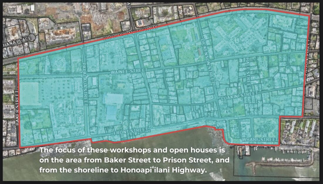 The Maui County Office of Recovery is inviting the community to share their opinions on the way streets in the commercial core of Lahaina are rebuilt, including Front Street. The planning area extends from Baker Street to Prison Street and from Honoapiilani Highway down to the shoreline. Photo courtesy Front Street Recovery