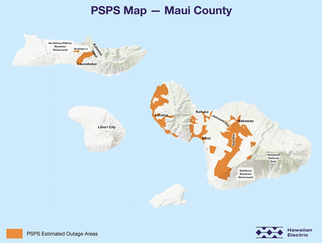 Hawaiian Electric, the parent company of Maui Electric, has developed a Public Safety Power Shutoff program in an effort to prevent wildfires. The map has identified vulnerable areas of Maui County including places with persistent drought conditions and low humidity, with potential high winds that may be subject to power shutoffs. Photo courtesy Hawaiian Electric