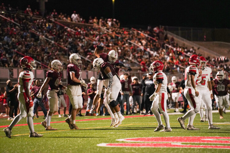 The Baldwin football team celebrates in the end zone after senior wideout Hiilawe Han (5) caught a touchdown pass from quarterback Jorden Carbonell in the first quarter of a Maui Interscholastic League Division 1 football game on Saturday at Lahainaluna High School. Baldwin won 14-7. The Maui News/Eli Pace