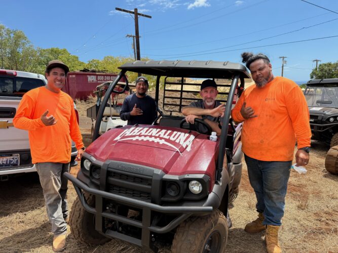 Maui Land & Pineapple Co. team members and Lahainaluna High School alumni Palani Wright (left) and Danny Kauvaka (right) check in with LHS Facilities Manager BJ Alvarez (center left) and Lahainaluna Athletics Director Jonathan Conrad while clearing an access road behind Lahainaluna High School for firefighters to use while combating wildfire. Photo courtesy Maui United Way