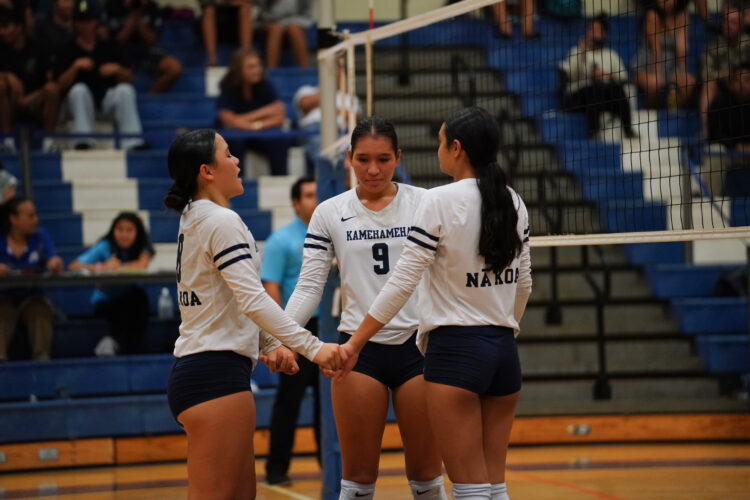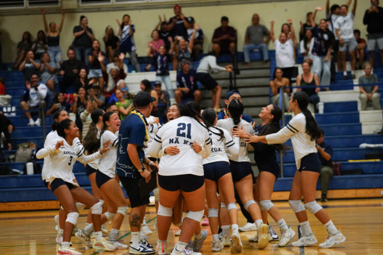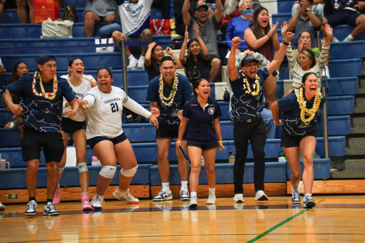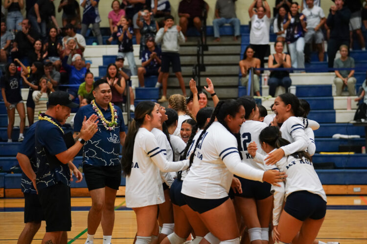 The Kamehameha Maui girls volleyball team celebrates after defeating King Kekaulike in the championship game of the Maui Interscholastic League Division I tournament Tuesday at Maui High School. The Maui News/Eli Pace