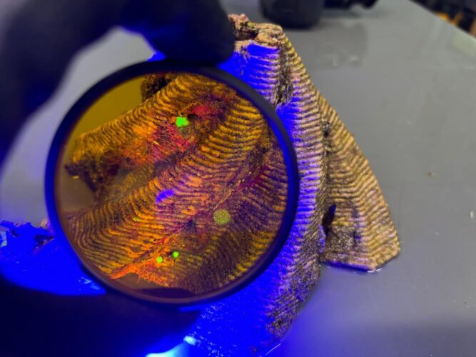 Coral recruits glow bright green under blue light when viewed through a yellow filter, making it easier to spot and count them among the textured surfaces of the modules. This method helps the researchers to track coral survival over time. Photo courtesy Marina Rottmueller