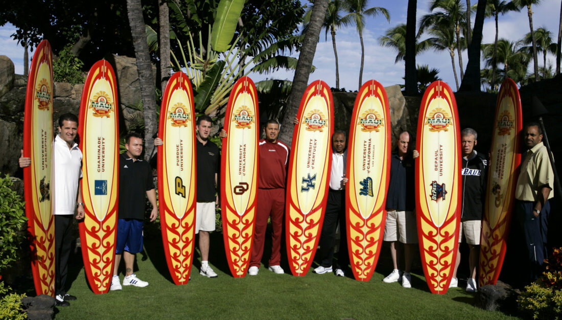 Coaches of the teams participating in the 2006 Maui Invitational college basketball tournament pose with surfboards following a news conference to kick off the tournament in Lahaina. From left to right are Memphis' John Calipari, Chaminade's Matt Mahar, Purdue's Matt Painter, Oklahoma's Jeff Capel, Kentucky's Tubby Smith, UCLA's Ben Howland, Depaul's Jerry Wainwright and Georgia Tech's Paul Hewitt. (AP Photo/Michael Conroy)