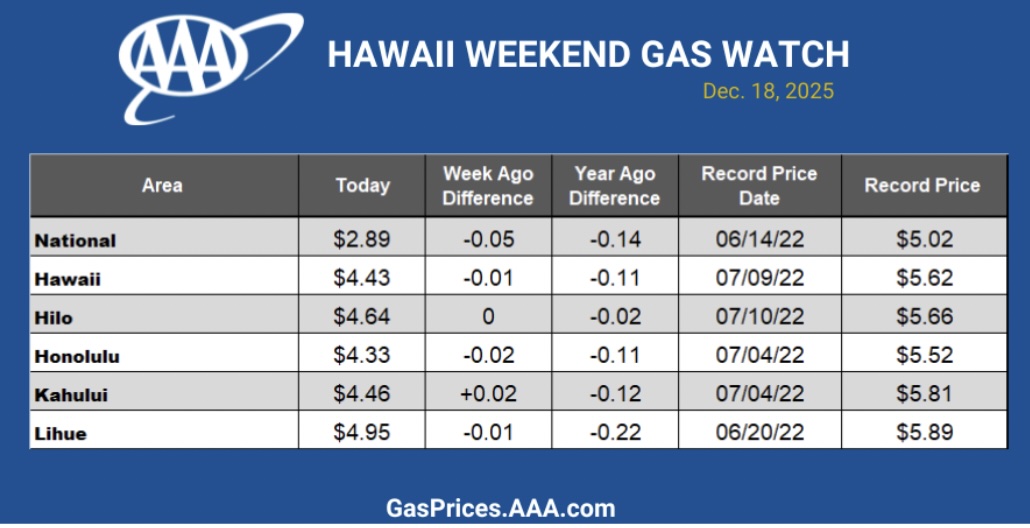 Gas prices across Hawaii have fallen to their lowest levels of 2025, mirroring a national trend, according to AAA Hawaii.