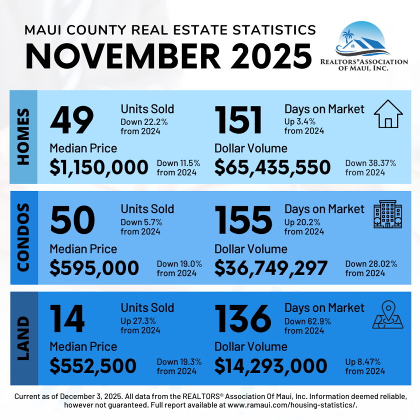 Maui’s housing market slowed in November as both sales and median prices declined compared with a year earlier, according to the Realtors Association of Maui.