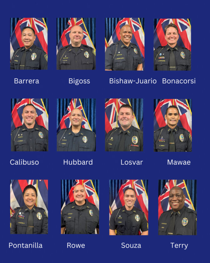 In 2014, he was assigned to the Criminal Investigation Division’s Domestic Violence Unit. He was promoted to sergeant in 2016 and has since served in the Molokai Patrol District, the Criminal Investigation Division as a detective, and most recently as a supervisor in the Lahaina Patrol Division.