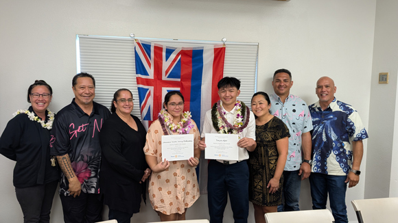 Club President Mary Albitz presented the awards to Tevyn Apo, a senior at Kamehameha Schools Maui, and Johnneece Kilohilani “Kilohi” Moniz-Kekumu, a senior at King Kekaulike High School, during a recent ceremony.
