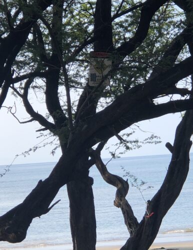 Tree branches partially block one of the shark warning signs at Olowalu. Gary Kubota/The Maui News