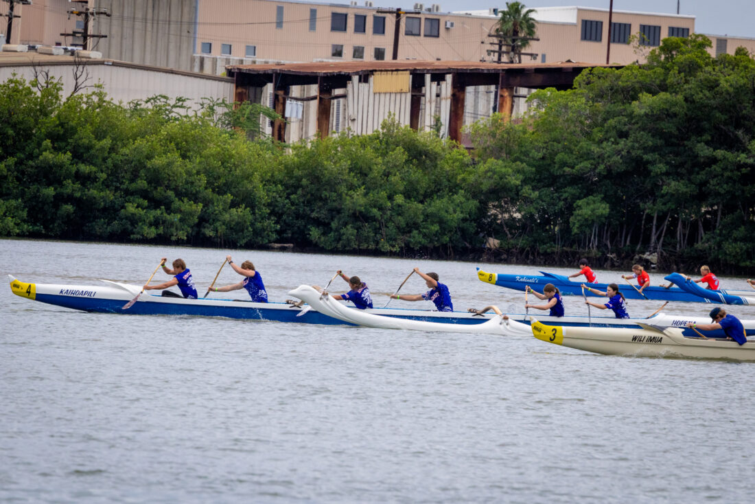Seabury Hall competes in the Hawaii High School Athletic Association Division II state mixed canoe paddling championship race Saturday at Keʻehi Lagoon Beach Park on Oahu. Bryan Berkowitz/Seabury Hall