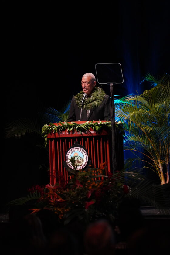 The Kuikawa Trio, a young up-and-coming group from Maui, entertained the audience for almost an hour as guests were finding their seats before the ceremony. The Maui Fire Department Color Guard sang “The Star-Spangled Banner” and “Hawai’i Pono’ī.”