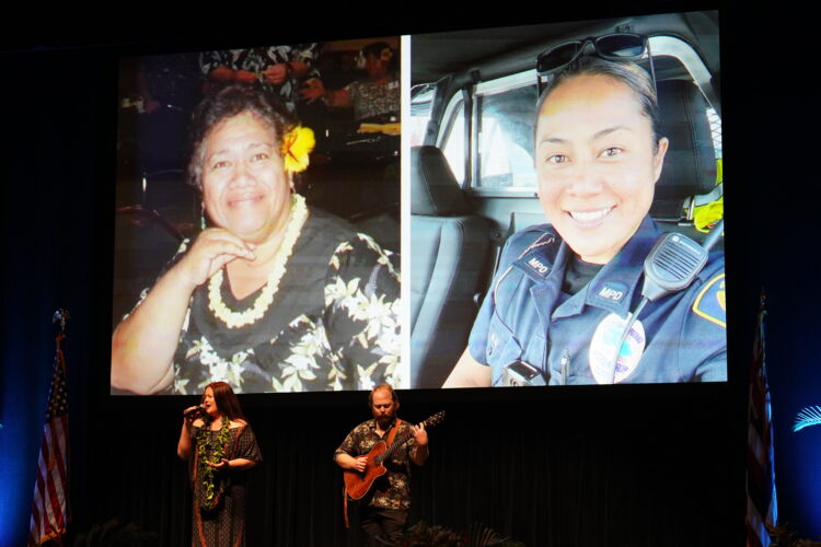 The State of the County address featured a tribute from award-winning singer and songwriter Amy Hānaialiʻi honoring Maui Police Officer Suzanne O and Maui County Council member Tasha Kama. During the tribute, Hānaialiʻi sang “Light a Candle for Me” with large images of Officer O and Kama smiling projected behind her.
