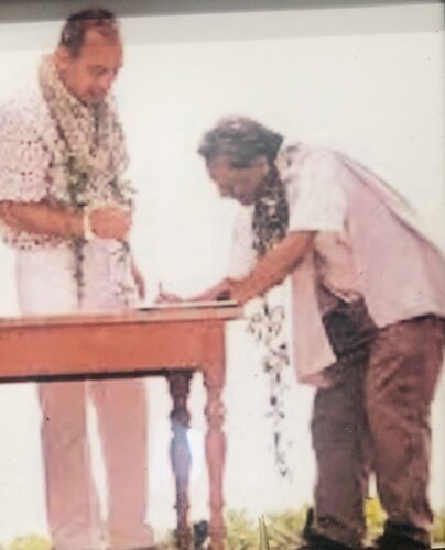 Noa Emmett Aluli, standing next to Gov. John Waihee, signs the document conveying Kaho’olawe island from the Navy to the state of Hawaii on May 7, 1994. Aluli, co-founder of the Protect Kaho’olawe Ohana, signed as the new chair of the state Kaho’olawe Island Reserve Commission. Photo courtesy Kaho’olawe Island Reserve Commission