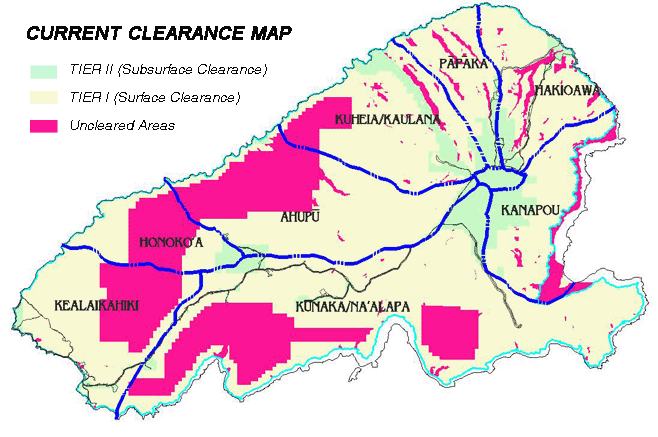 A map of Kaho’olawe illustrates the safe areas from those that still have ordnances. Photo courtesy Kaho’olawe Island Reserve Commission