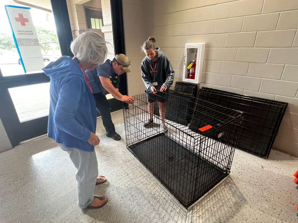 Community volunteers assemble pet crates at a shelter set up for residents during the powerful kona storm. Photo courtesy Maui County