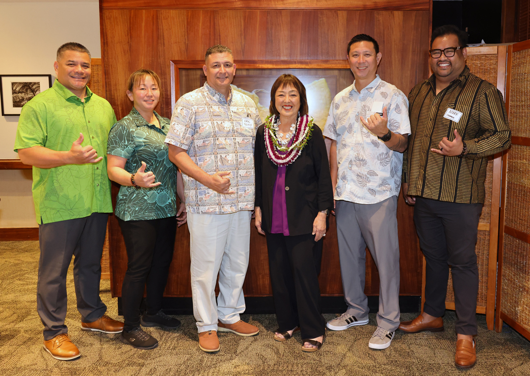 Maui County mayoral candidate Yuki Lei Sugimura (center, right) poses for a photo with Dione Kalaola, (from left) Trisha Taketa, Eric Reiny, Travis Murakami and Mark Anthony Clemente.