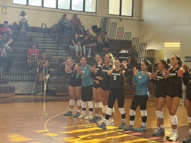 Hawaii Pacific setter Jordyn McCutcheon (5) greets the crowd before the Sharks’ match against Chaminade on Saturday. Photo courtesy Hawaiian Style Volleyball Club