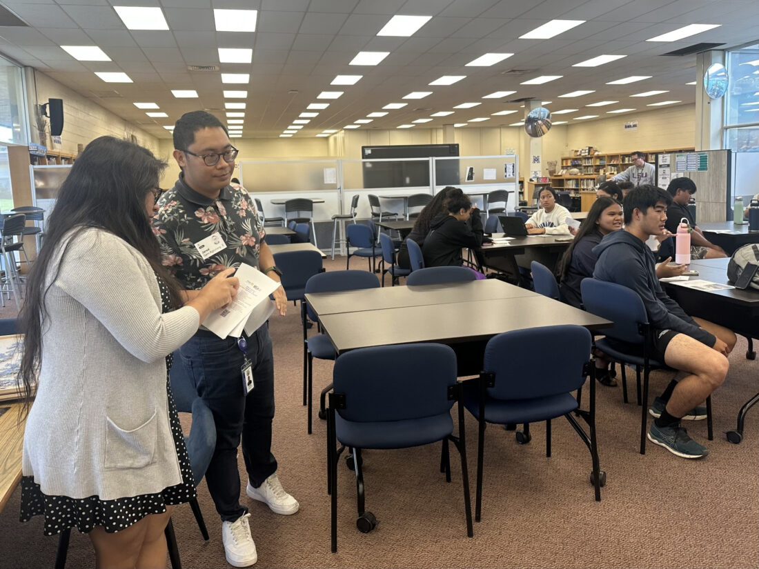 Donna Marie Paz and JaredSam Agtunong, serving as One-Day Rotary Youth Leadership Awards facilitators, prepare to present details about the workshop during a recent Maui High School Club Council meeting. Courtesy photo