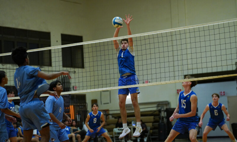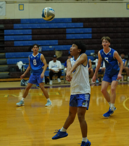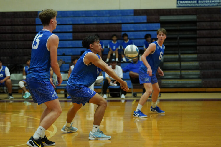 Maui High senior Joey Whaley (1) keeps the ball in play as the Sabers face Baldwin on Tuesday. Eli Pace/The Maui News