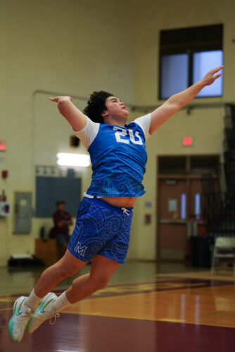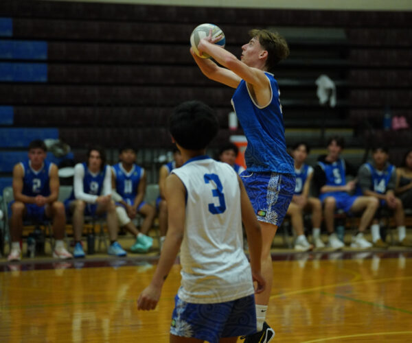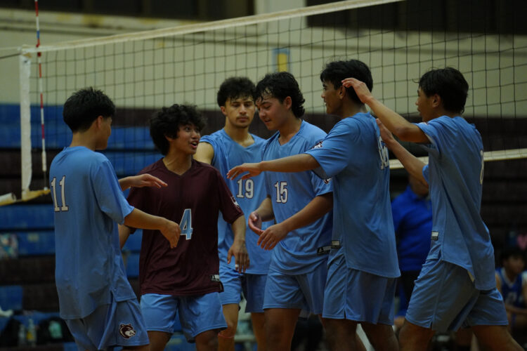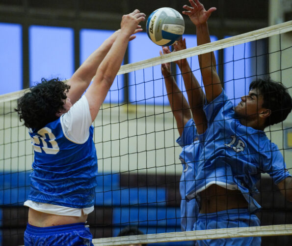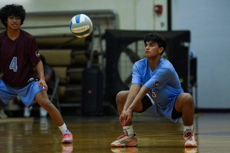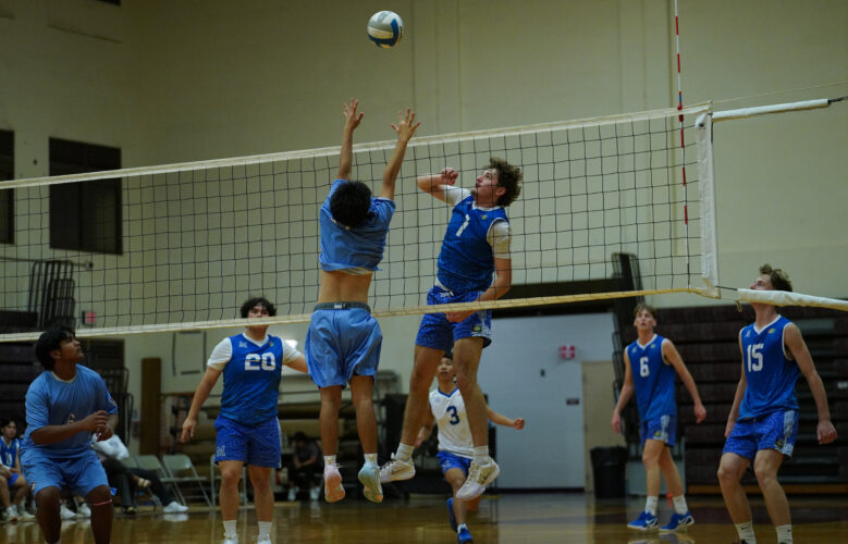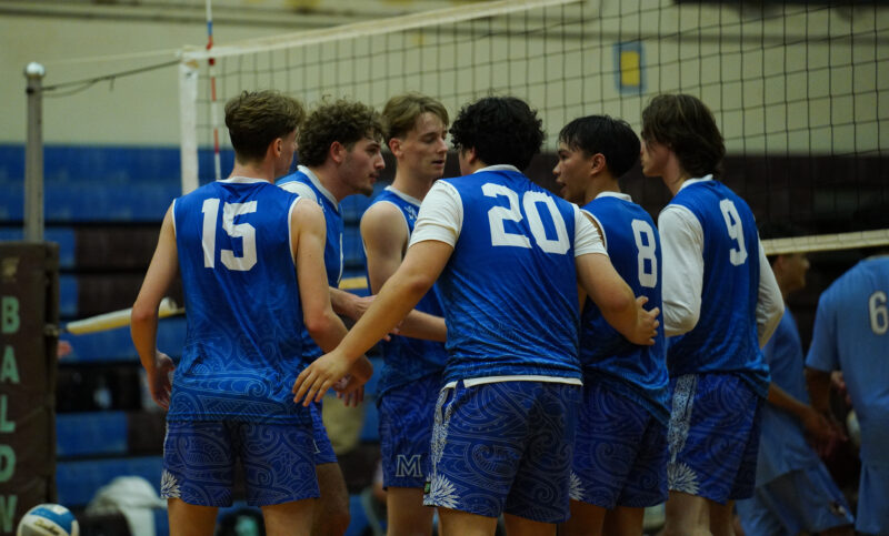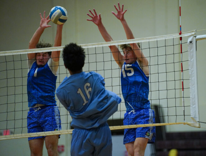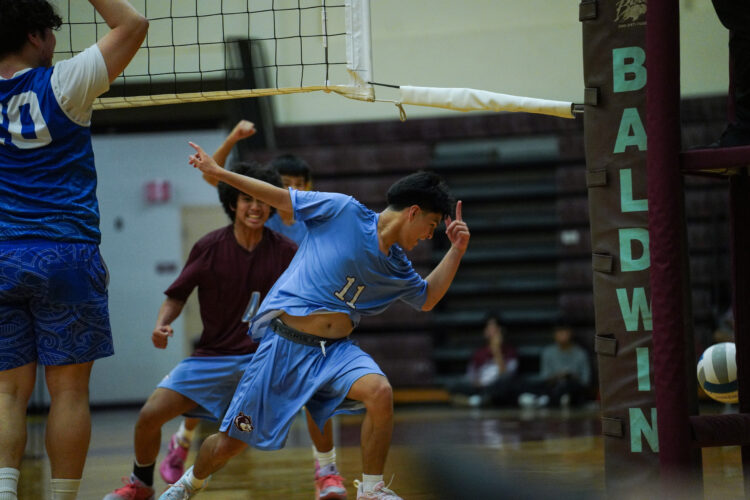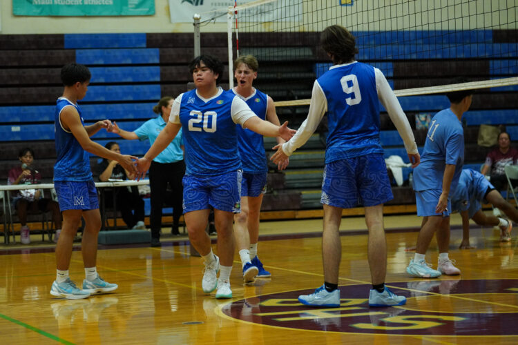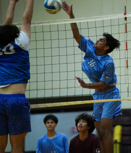 Estores (11) and Ezequiel Corpuz (4) react as the ball goes out of bounds for a point for the Bears against Maui High. Eli Pace/The Maui News