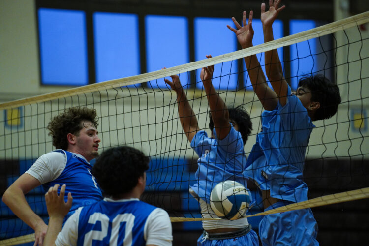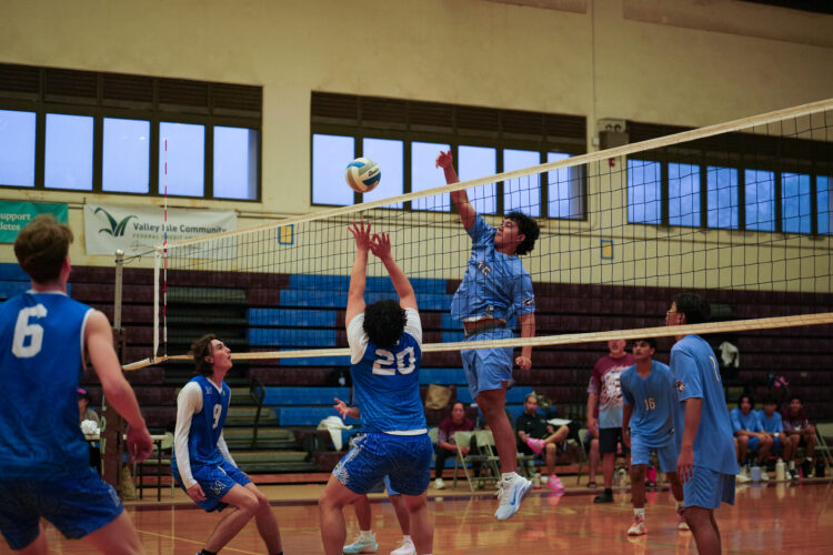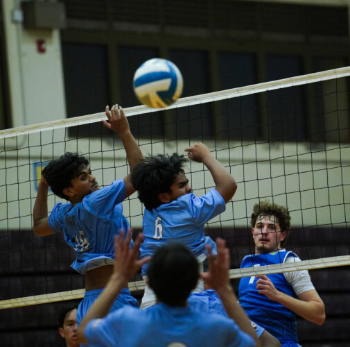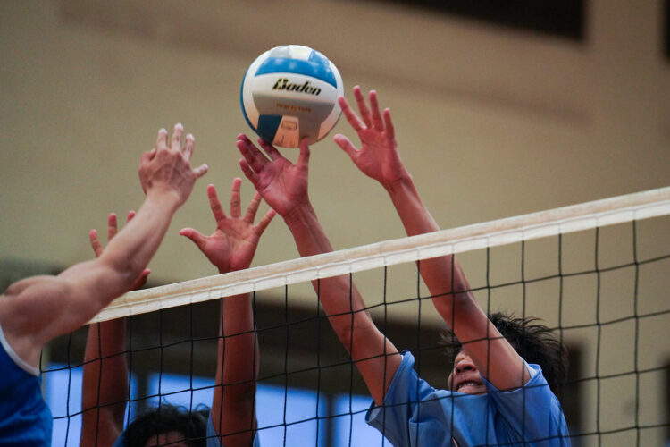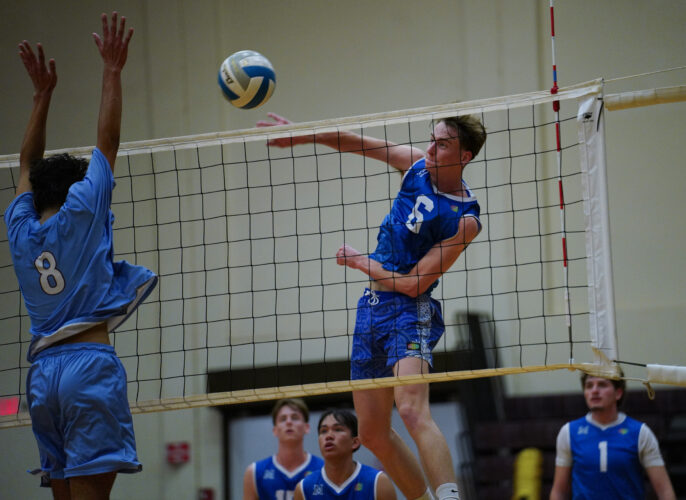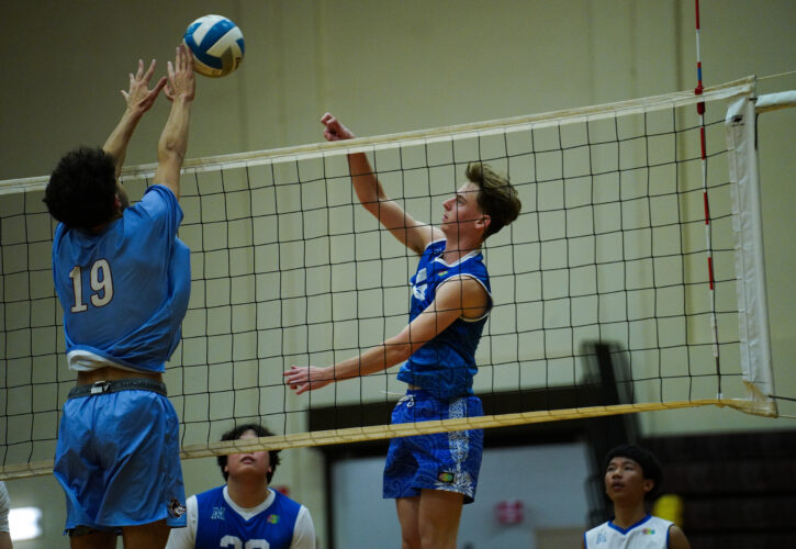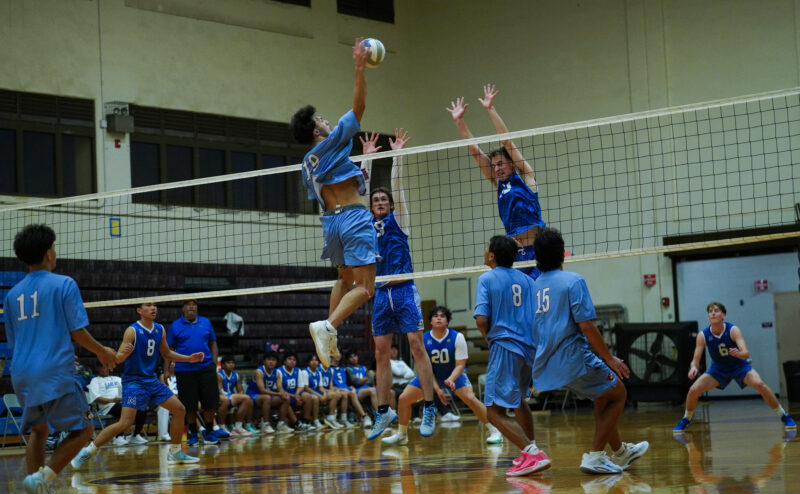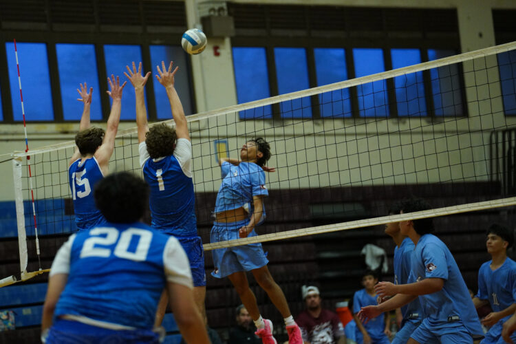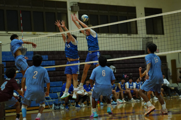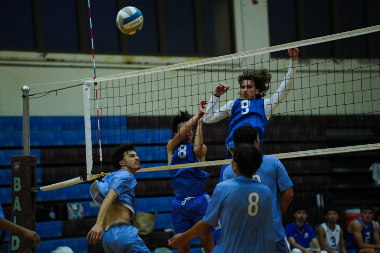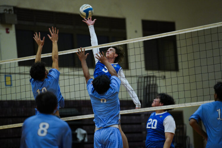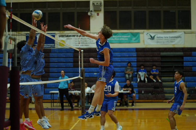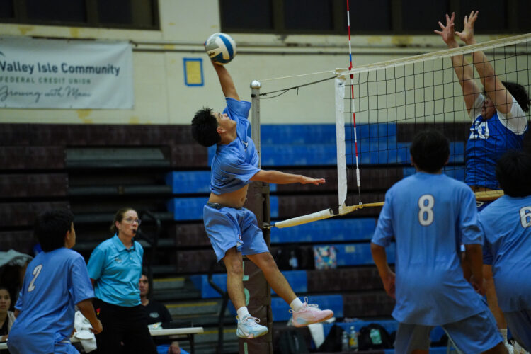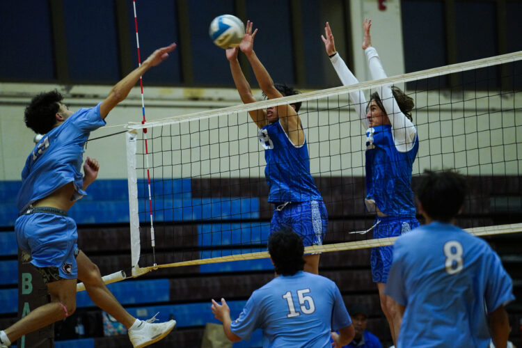 Baldwin senior Dylan Kuia (19) spikes the ball as Maui High’s Mckenzie Poston (9) and Zachary Prangnell (15) go for the block at the net with teammates Keanu Fujimoto (8), Andrew Guzman (20) and Luke Prangnell (6) behind them during a Maui Interscholastic League Division I boys volleyball game Tuesday at Baldwin High School. Maui High won 25-20, 25-15, 25-20. Eli Pace/The Maui News