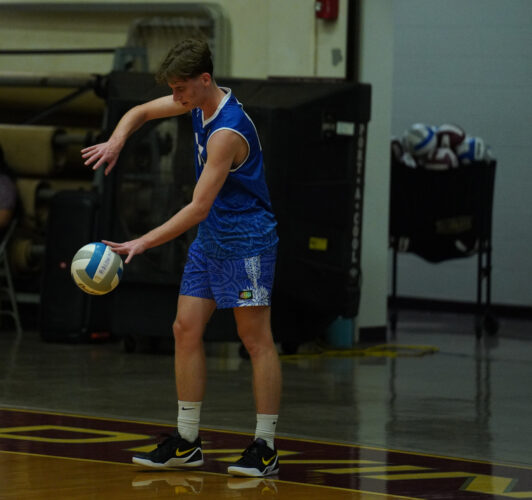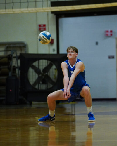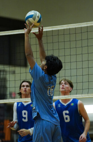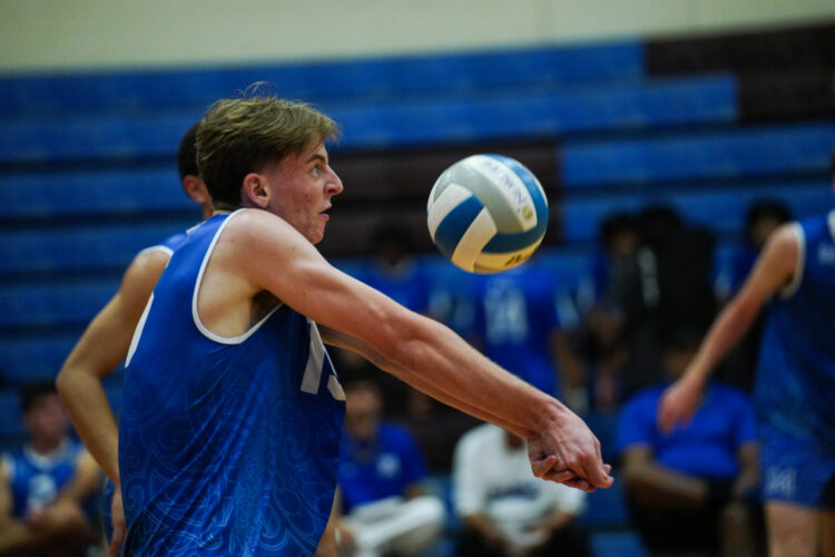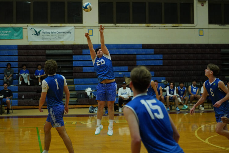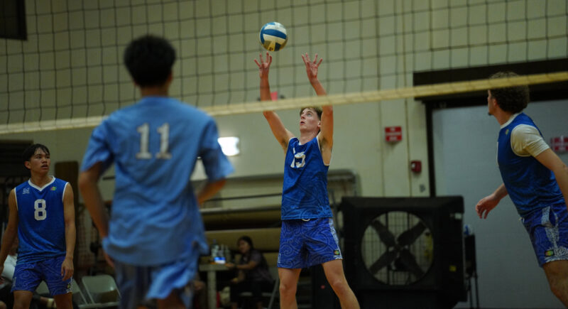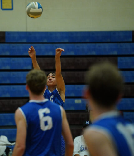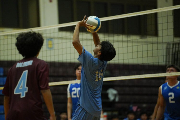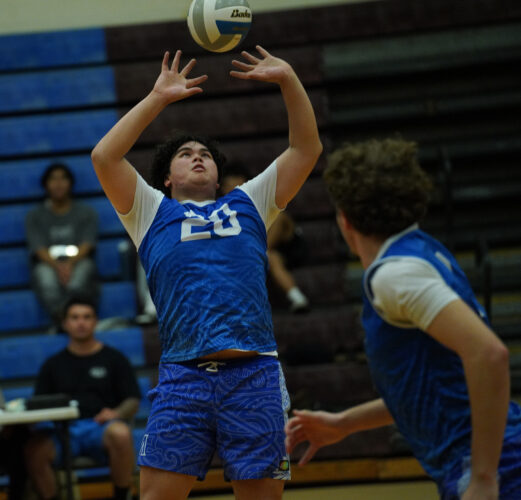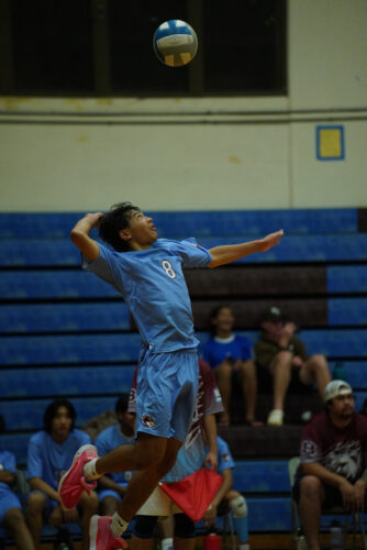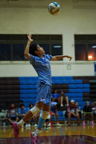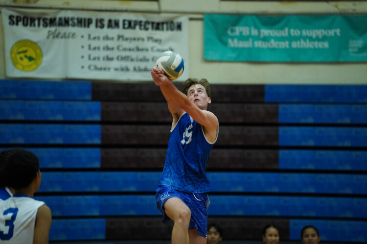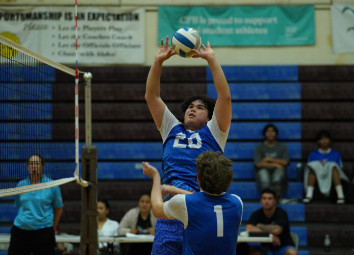 Sabers senior Andrew Guzman (20) sets the ball against Baldwin. Eli Pace/The Maui News