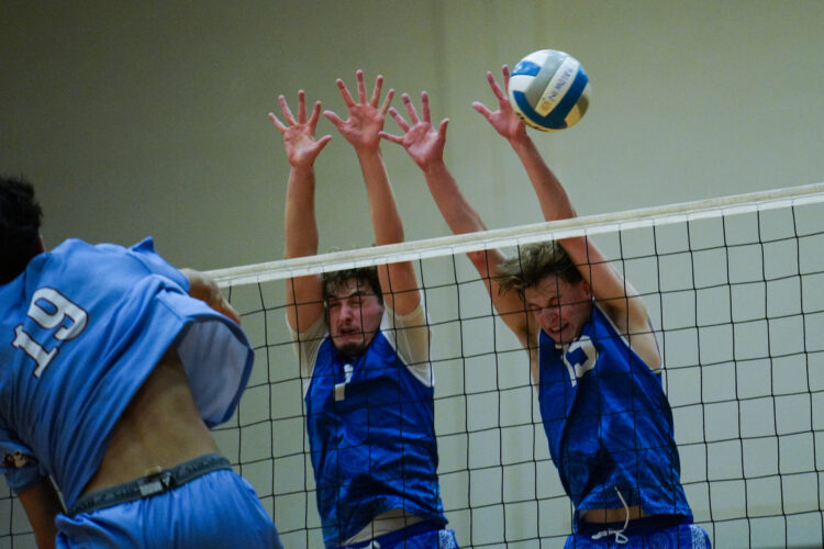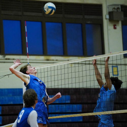 Maui High senior Zachary Prangnell goes for a kill with Baldwin senior Dylan Kuia defending and Sabers teammates Andrew Guzman (20) and Mckenzie Poston (9) looking on. Maui High improved its record to 7-0 Tuesday by defeating Baldwin 25-20, 25-15, 25-20 in a Maui Interscholastic League Division I boys volleyball game in Jon Garcia Gym at Baldwin High School. Eli Pace/The Maui News