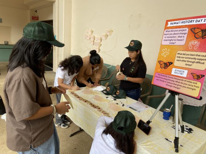 Roots Reborn leads an activity in which students respond to a question prompt of their choice (on the stand) on a cutout of a butterfly, which is then taped to the wall. The butterfly is a combination of a monarch butterfly, symbolizing migration over great distances, and the kamehameha butterfly, indigenous to Hawaii. In the green hat is Jessica Rosado of Roots Reborn. Also from Roots Reborn were Natalia Formero and Veronica Mendoza, Founding Executive Director. Courtesy photo